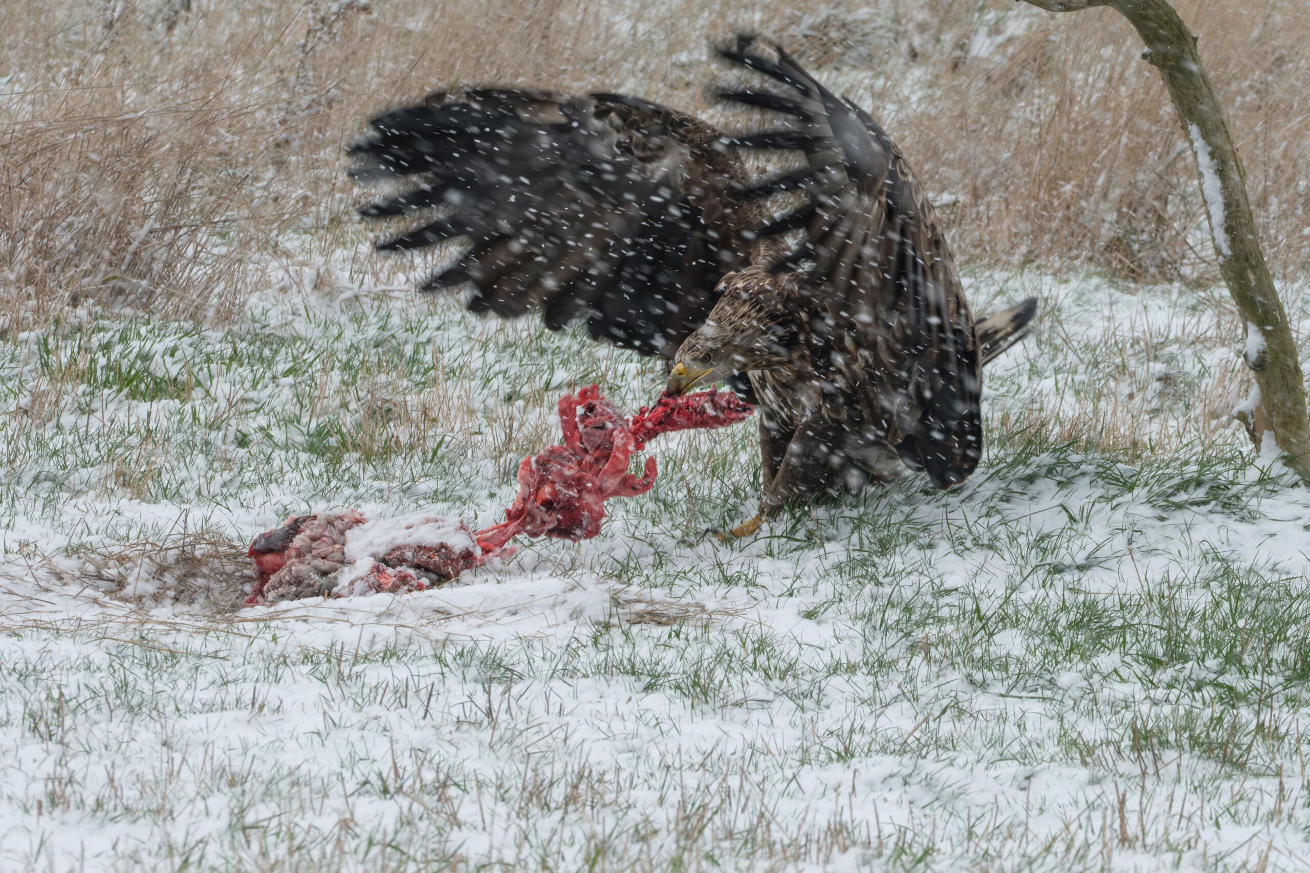 Die Seeadler haben das Fotohide perfekt angenommen und kommen regelmäßig zum Luderplatz. Die Entfernung von dem Fotohide zum Ansitzast und Luderplatz beträgt 40m. Mehr kann unter dem Reiter „Fotohide“ entnommen werden.